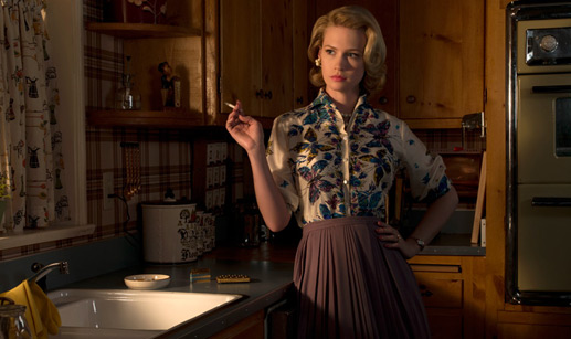 Joan Holloway is smarter and sassier than Betty; I think she might be my favourite character. No, I am certain of it. She too conforms to the beauty myth, but she takes everything—heavy make-up, bombshell tits, coy glances—to the extreme, almost caricaturing them. Joan is a female transvestite. She knows that looking and behaving in certain ways will elicit male appreciation, and that such admiration is crucial for career advancement. The problem is that Joan succeeds only as a sexualized object, and is not taken seriously as a thinking individual by either men or women (except her lesbian roommate—missed opportunity for happiness there). Joan is highly intelligent and savvy about the advertising world, and yet that mug Harry cannot see the value of her as anything other than an attractive servant with a whiff of dominatrix about her. Joan will never get what she wants: respect and love without compromise.