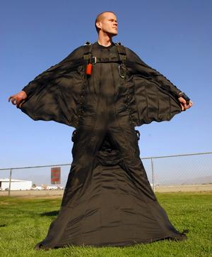 I bet I would get lucky in about five minutes, especially if I adopted the same limp-wristed submission pose pictured above, at least according to the ‘How to Read Sexual Signals’ Web site. Here is an insightful tip for straight ladies: Men like cleavage. Any kind of cleavage. Any at all. [Gratuitous aside: Just the other week, I said to my partner: ‘I know how to increase traffic on my web site! I will start posting pictures of me with my tits out. Because they are great! He couldn’t have agreed more]. Back to my magnificent Saturday night: It turns out that the manly-man-guest—Fitbabe calls him ‘Ginger R’—was referring to those aerodynamic flying outfits worn by crazy fuckers who like to jump off cliffs and out of planes, waiting until the last minute to deploy their parachutes. Like this guy.
