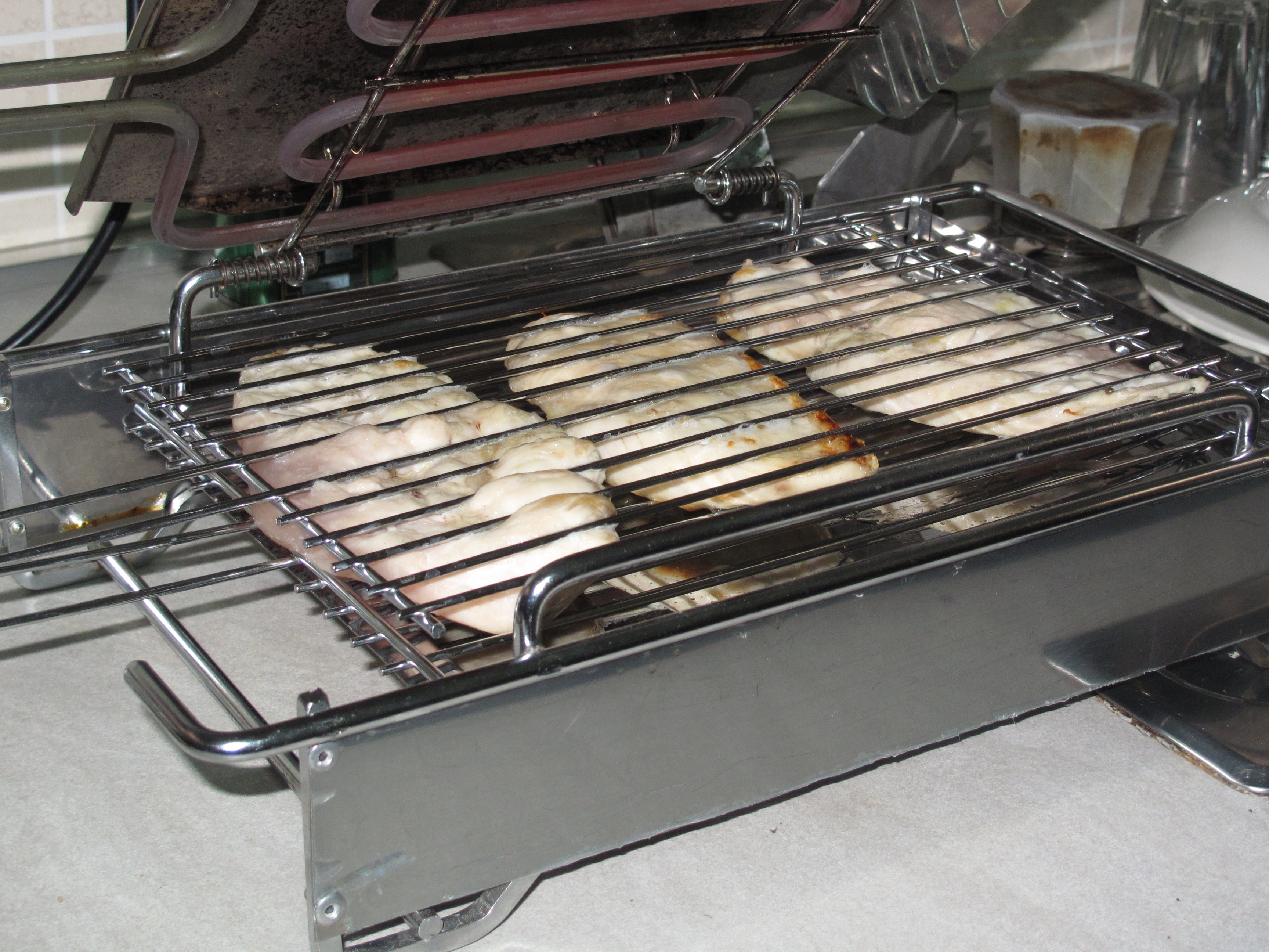 Last night, the three of us returned from the shops and open-air market with bags of scented produce and chicken breasts, which we grilled on an ingenious machine that I found in the cupboard. No batter, topping or oil required. Not even Pam. Take note Fitbabe! Where can I buy one of these shiny silver heat rod trays?