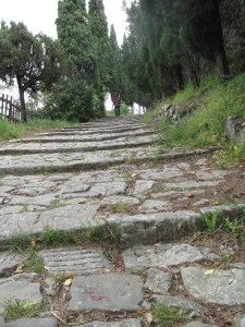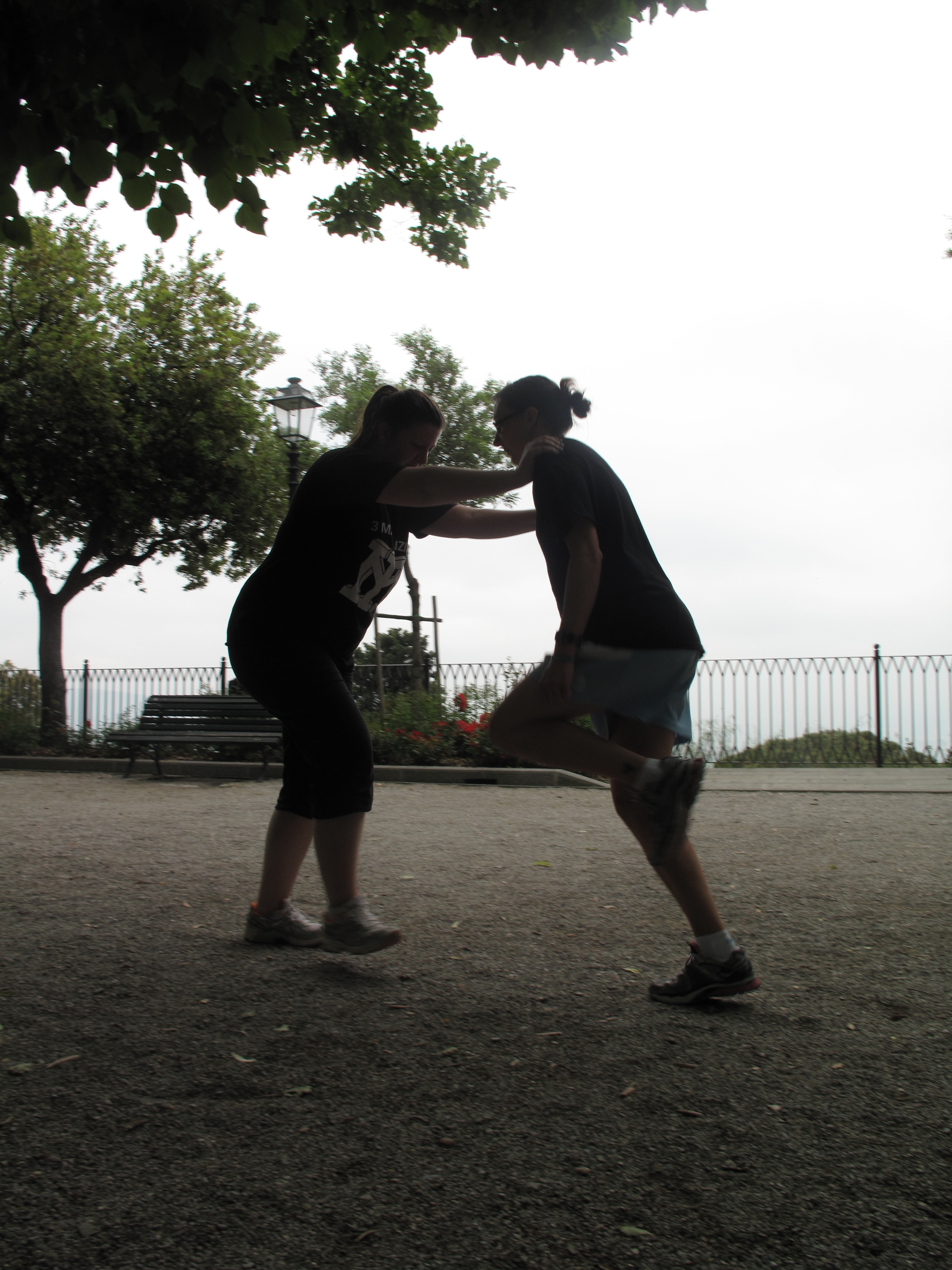 One morning we did a partner workout, featuring squats, resisted skipping (both shown above), ox pulls, and some ab work. On other days we did giant sets for legs, with bench jumps, sprint drills, burpees, squat jumps, and lunges. We alternated upper body sets with jogging, and did a variety of circuits. I especially enjoyed 100 pushup day, and I am pretty sure that the students did too, despite being too shy to say so. Although I had brought with me from Canada an inflatable ball and some exercise bands, it was difficult to work our backs fully, since we could not find a proper place to perform chin ups. Italian playground equipment is made of thick square wooden beams that are too large for lady hands to grasp. Plus my continual scanning of jungle gyms put me on the official Italian ‘pervo watch’ list, and I had to admit defeat, allowing my lats to wither. [Aside: I am hitting those lazy bitches hard now, having done over 60 chin ups since my return home].
