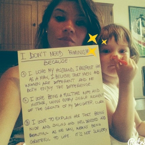The anti-feminists both over- and underestimate the impact of feminism. If they imagine that a powerful lobby group of man-hating lesbians is controlling the world, then they have missed the mark [sadly enough, because that would be an improvement]. These women nevertheless underestimate the lasting effects of feminist efforts, and the ways in which these efforts have shaped their own lives and identities. Some of them claim, for instance, that they “choose” to be mothers and homemakers, offering up their lifestyle as both defiant and radical. Yet the very language that they use (“choice”), and the fact that they can choose their lives instead of being forced to marry and reproduce stems from the influence of feminism. Let’s face it, the ability of these women to voice their opinions and boldly insist that those opinions are important—i.e. the very idea that they can talk and someone will give a flying fuck about what they have to say—makes them feminists, or at least indebted to feminists. The tenets of feminism have penetrated our culture so deeply that they seem like commonsense: men and women are equal (liberal feminism), women are human beings and must be treated as such, women’s amazing reproductive capacities must be respected, as should the labour of mothering (marxist or socialist feminism), difference should be celebrated and not erased (difference feminism) etc. etc.
